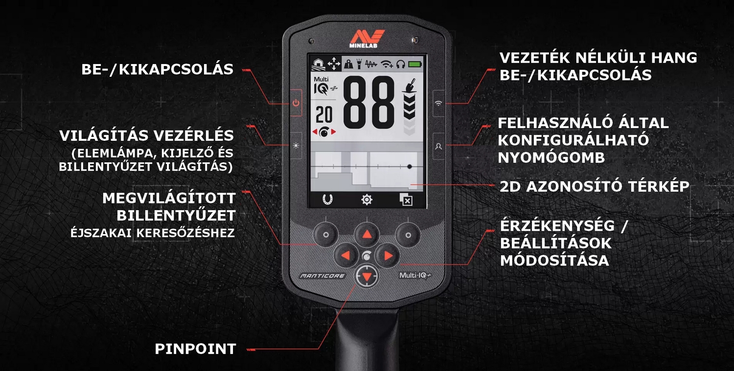 A Minelab gépek csúcstechnológiája csak a történet egyik fele. Ugyanilyen fontos, hogy a MANTICORE teljesítménye könnyen hozzáférhető legyen. Ezért a MANTICORE nagyméretű színes képernyővel rendelkezik, és a valaha volt legintuitívabb felhasználói élményt nyújtja egy detektorban.